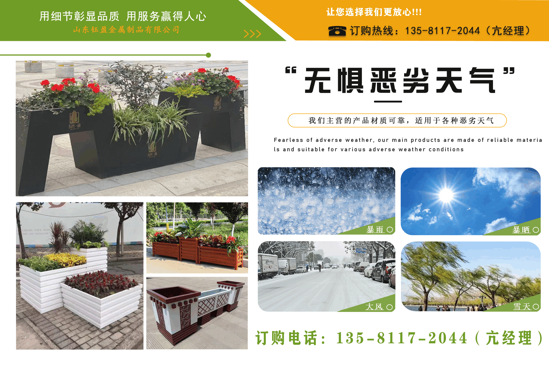 山東鈺盈金屬制品有限公司主營鍍鋅板花箱,道路隔斷花箱,定制花箱,戶外道路花箱,花箱座椅等產(chǎn)品,產(chǎn)品結構合理、性能優(yōu)良,具有強度高、耐腐蝕、抗老化、隔熱隔音、節(jié)約能源、外形美觀、使用壽命長等優(yōu)點,深受國內(nèi)外客戶認可。 我們根據(jù)客戶所在城市的文化特征,制造出符合當?shù)爻鞘形幕瘹庀⒌淖匀涣Ⅲw、觀賞性強的花箱產(chǎn)品成為城市里一道靚麗的風景線。 公司實行誠實、公正、守信、價格合理、平等互利。 公司憑借雄厚經(jīng)驗實力,恪守誠信為本的原則,得到了眾多客戶的信賴,并在業(yè)界獲得良好的口碑。建立了穩(wěn)固的合作關系,隨著業(yè)務的不斷發(fā)展和壯大,合作伙伴的范圍也在不斷擴大。我們熱情盼望與您的合作,為社會的可持續(xù)發(fā)展獻上一份努力。...
